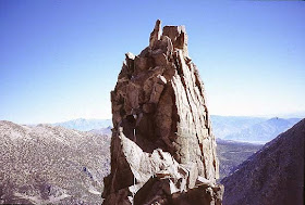 I guess I really didn't know what the route was supposed to be at the time, but I envisioned a traverse across the N face ledge system and up the summit cone, which is what we did. Reading further later, it appears as if the FA was up the NE couloir direct then up the N. Face. Oh well, our route was pretty cool, if rather loose in places. We got an alpine start and summited early. Descent was made via the E ridge until dropping the couloir (extremely loose!) back to Longley Reservoir. We never did rope up although we rappeled  at least once going down the E ridge. We hiked out to the car the same day.